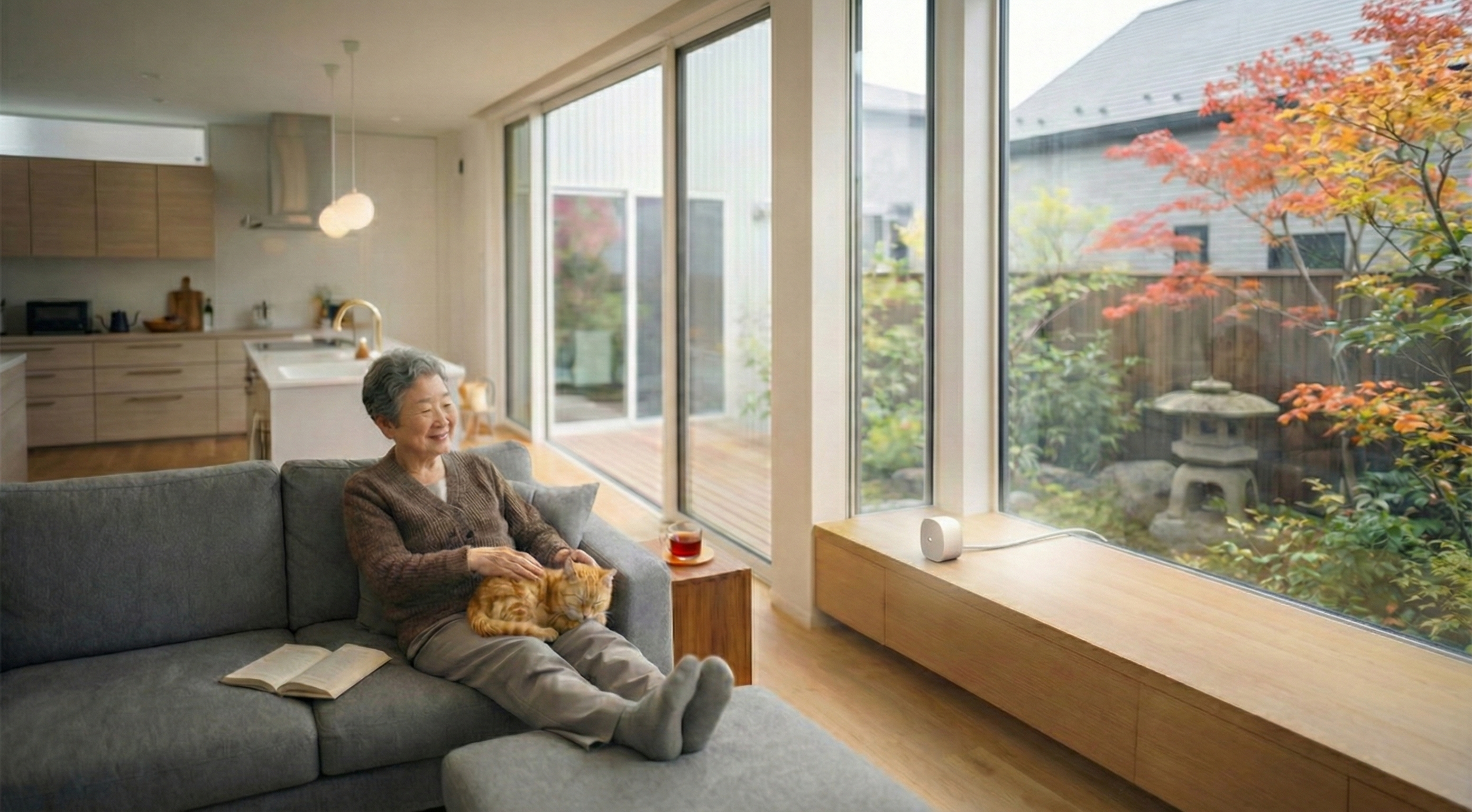 人感センサーが朝7時の起床を確認。いつも通りリビングへ移動。「今日も元気そうね」と安心できる朝。