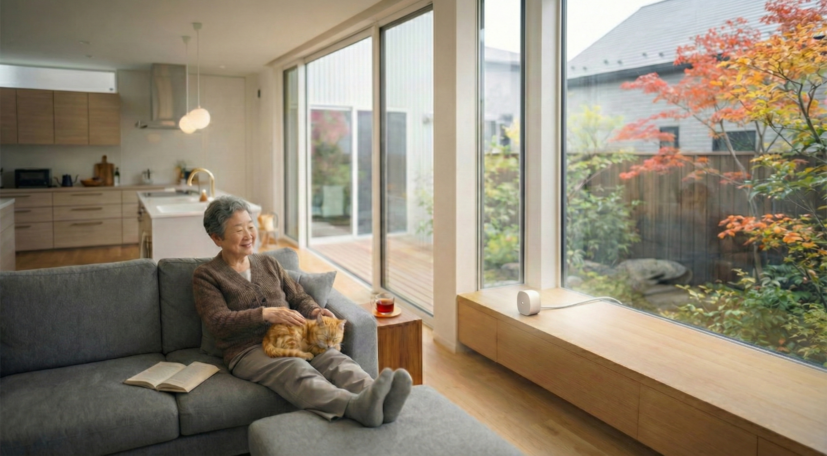 人感センサーが朝7時の起床を確認。いつも通りリビングへ移動。「今日も元気そうね」と安心できる朝。
